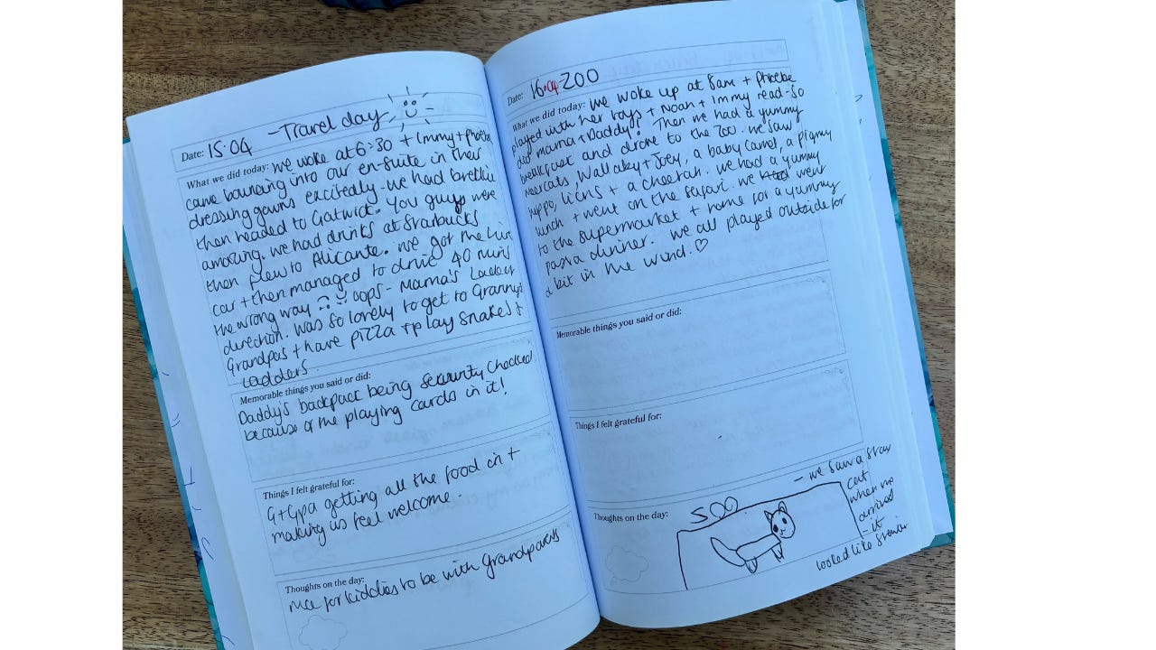 It’s become a record of our family time together. I write in it at the weekends or on holiday. Sometimes it does feel like just another thing to do, but it’s so lovely to read back over, as I often forget what we have done and the cute things the kids have said. You don’t need a special journal to do this but if you’d like one - ours is hardback and on sale on amazon - Memory Journal for Parents